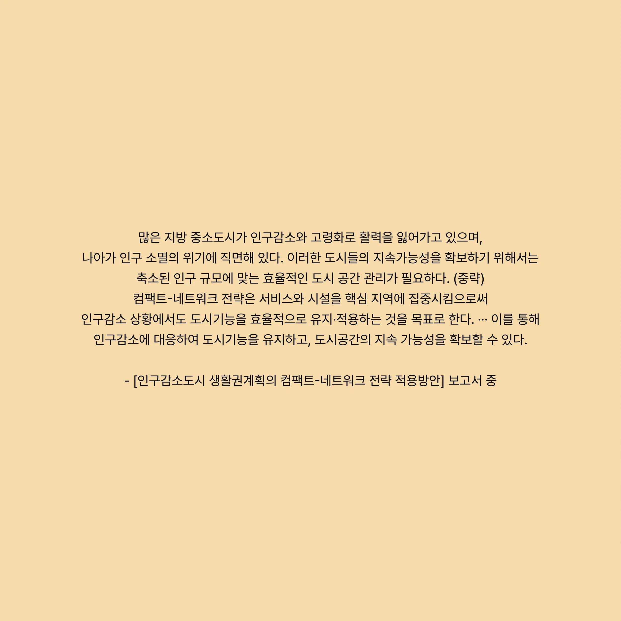 본 연구는 건축공간연구원의 2024년 기본연구보고서 [인구감소도시 생활권계획의 컴팩트-네트워크 전략 적용방안]으로 제출되었다.